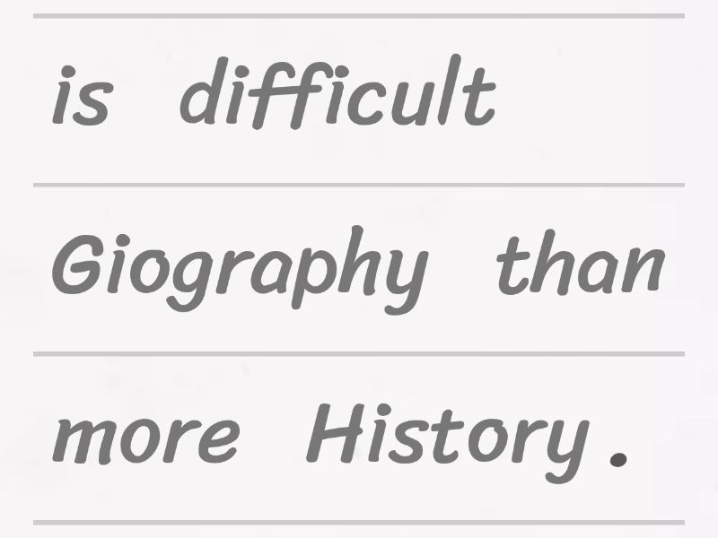 History is more difficult than Giography., Russia is the biggest country in the world., Molly is better at science than her friend., My brother is shorter than me., Janet has got longer hair than her sister., Basketball is faster game than football., Football is the most popular sport in the world., He is the fastest runner in the class., Everest is the highest montain in the world. , Bob is the tallest of all.,