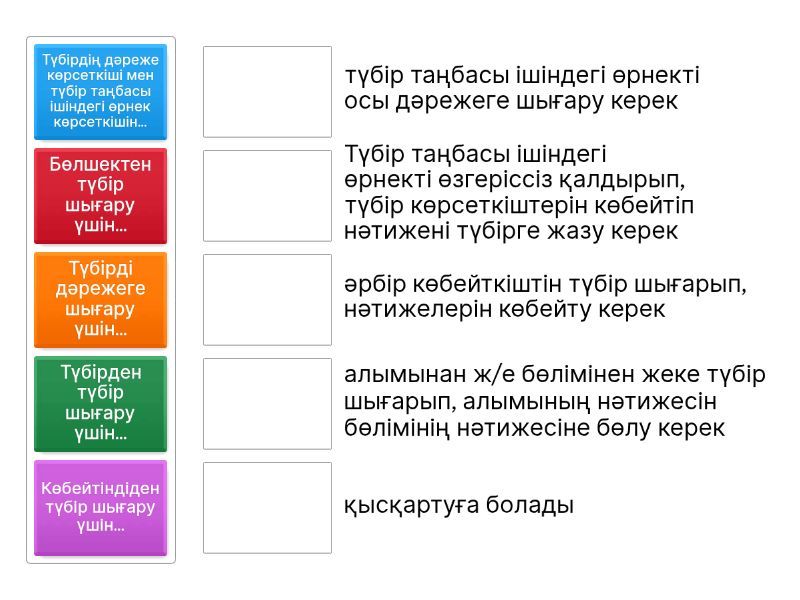 Көбейтіндіден түбір шығару үшін... - әрбір көбейткіштін түбір шығарып, нәтижелерін көбейту керек , Бөлшектен түбір шығару үшін... - алымынан ж/е бөлімінен жеке түбір шығарып, алымының нәтижесін бөлімінің нәтижесіне бөлу керек, Түбірдің дәреже көрсеткіші мен түбір таңбасы ішіндегі өрнек көрсеткішін... - қысқартуға болады, Түбірді дәрежеге шығару үшін... - түбір таңбасы ішіндегі өрнекті осы дәрежеге шығару керек, Түбірден түбір шығару үшін... - Түбір таңбасы ішіндегі өрнекті өзгеріссіз қалдырып, түбір көрсеткіштерін көбейтіп нәтижені түбірге жазу керек,