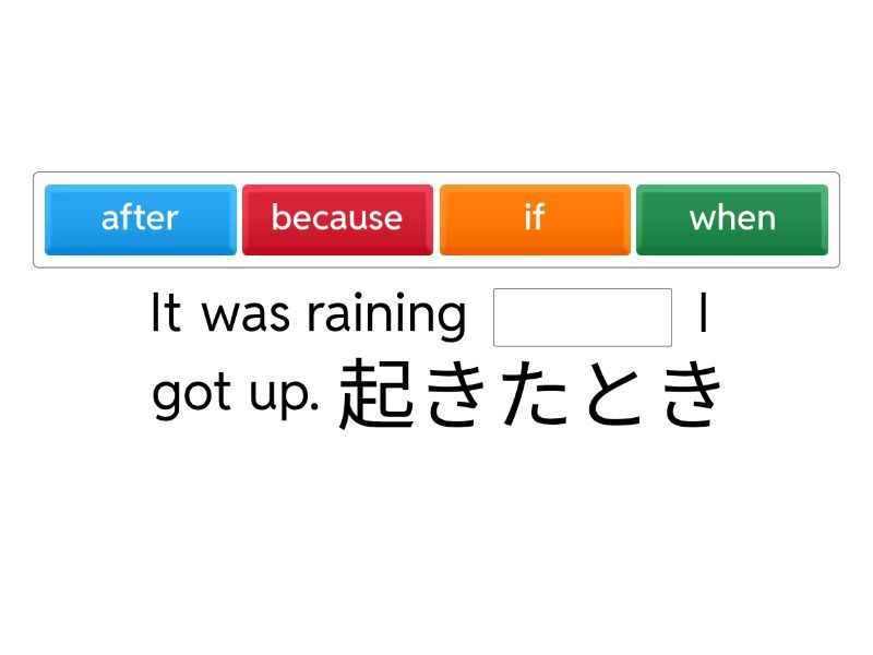 It was raining ____ I got up. 起きたとき Please join us ____ you are free. もしひまなら I stayed home ____ I was sick. 病気だったので Wash your hands ____ you eat dinner. 食べる前に Let's play tennis ____ you finish your homework. 終わった後 Can you lend me your glove ____ you're not using it? 使っていないとき Please call me ____ you arrive at the airport. ついたら、ついたとき I'm studying ____ I have a test tomorrow. テストがあるので Practice the piano ____ you eat dinner. 食べた後に I like Doraemon ____ it's funny. おもしろいから