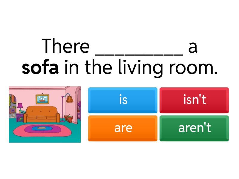 1) There _________ a sofa in the living room. a) is b) isn't c) are d) aren't 2) There are four apples in the picture. a) true b) false 3) There ______ a computer in the office. a) are b) isn't c) is d) aren't 4) Is there a fridge in the kitchen? a) Yes, there is. b) No, there isn't. c) Yes, there are. d) No, there aren't. 5) There are two cats in the picture. a) true b) false 6) There _______ four cushions in the picture. a) aren't b) is c) isn't d) are 7) There ________ a rug by the door a) is b) aren't c) are d) isn't 8) There is a TV in the living room. a) true b) false 9) _______ there flowers in this picture? a) Is b) Are c) Isn't 10) There is a dog in this picture. a) true b) false 11) There ______ two girls in this picture. a) is b) isn't c) are d) aren't 12) Are there sofas in the room? a) Yes, there is. b) No, there aren't. c) No, there isn't. d) Yes, there are. 13) Is there a teacher in the classroom? a) Yes, there is. b) No, there isn't. c) No, there aren't. 14) ____________ there a supermarket near here? a) Yes, there are. b) No, there is. c) Yes, there is a great one on the corner. 15) There ___________ a big ______________________ on the corner. It's across from the bank. a) is __________ school b) is __________ gas station c) is ____________ cinema 16) There ___________ a ______________ (be.........) the post office and the separtment store. a) is / school / behind b) is / drugstore / before c) is / gym / between 17) There ___________ a big ______________ (_________ ) Elm Street, (be......) the square.  a) is / café / on / before b) is / hotel / on / behind c) is / hotel / in / beside 18) There ___________ a ______________ (_________ ) the mall and the gas station ( ______ ) Main Street. a) is / library / next to / on b) is / bookstore / beside / in c) is / bank / in front of / on