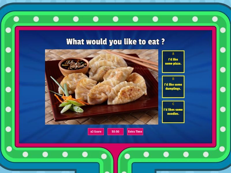 1) What would you like to eat ? a) I'd like some pizza. b) I'd like some dumplings. c) I'd likes some noodles. 2) What would you like to drink ? a) I'd like some milk tea, please. b) I'd like some black tea, please. c) I'd like some green tea, please. 3) What would you like to eat ? a) We'd like some pizza. b) We'd like some fried chicken. c) We'd like some noodles. 4) Would you like some French fries? a) Yes, please. b) Yes, I do. 5) What would you like to drink ? a) I'd like some coffee. b) I'd like some lemonade. c) I'd like a yogurt drink. 6) Would you like some rice? a) Yes, I like. b) Yes, please. c) No, thank you. 7) What would you like to drink ? a) I'd like some juice. b) I'd like some bubble tea. 8) Would you like some steak ? a) Yes, I do, please. b) No, thank you. 9) What would you like to eat for lunch? a) I'd like some sandwiches, some chips and some soda, please. b) I'd like some hamburgers, some fries, and some soup, please. 10) What would you like to eat for dinner? a) I'd like some fried chicken, a hot dog and some coke, please. b) I'd like some noodles, some rice and some tea, please. c) I'd like some steak, some pizza and some soup, please.