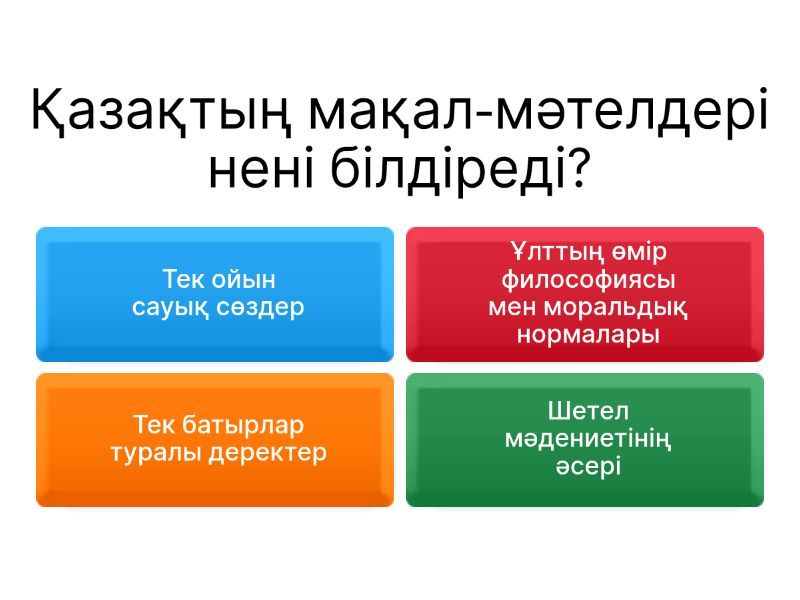 1) Қазақтың мақал-мәтелдері нені білдіреді? a) Тек ойын сауық сөздер b) Ұлттың өмір философиясы мен моральдық нормалары c) Тек батырлар туралы деректер d) Шетел мәдениетінің әсері 2) «Жақсылық қылсаң – өзің үшін» мақалында не туралы айтылады? a) Материалдық пайда b) Бай болу c) Рухани өсу, адамилық d) Жиі сыйлық алу 3) «Өтіріктің құйрығы бір-ақ тұтам» мақалындағы негізгі этикалық идея? a) Сабырлық b) Кішіпейілділік c) Қайырылымдылық d) Адалдық және шындық 4) «Уәде — Құдайдың аты» дегеніміз қандай құндылықты көрсетеді? a) Батылдық b) Уәде мен сөзге беріктік c) Еңбекқорлық d) Достық 5) «Үлкенге – құрмет, кішіге – ізет» мақалында қандай этика көрсетілген? a) Бәсеке b) Байлық c) Өзара сыйластық d) Еңбек 6) «Сөз сүйектен өтеді» мақалында қандай моральдық ереже бар? a) Жақсы киіну b) Сөйлеу мәдениетін сақтау c) Үнемдеу d) Жылдам әрекет ету e) Ереже жок 7) «Еңбек түбі — береке» мақалында не насихатталады? a) Демалу b) Еңбекқорлық c) Әділдік d) Ерлік 8) «Бірлік болмай тірлік болмас» халық даналығы нені меңзейді? a) Жеке адамға сену b) Бірлік пен ынтымақ c) Жылдам шешім қабылдау d) Денеңді шынықтыру 9) «Асығыс түбі – өкініс» дегеніміз қандай этикалық ой? a) Сабырлықтың маңызы b) Жылдамдықтың пайдасы c) Байлыққа ұмтылу d) Достық 10) Мақал-мәтелдердің жалпы этикалық мақсаты қандай? a) Материалдық тұрмысқа үйрету b) Қоғамдағы моральдық нормаларды қалыптастыру c) Тек өткен тарихты баяндау d) Ғылыми терминдерді түсіндіру