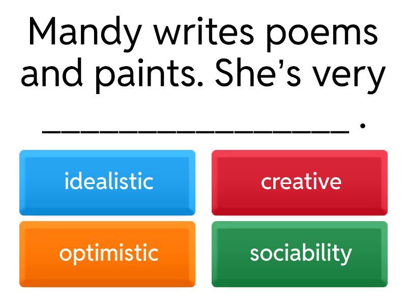 1) Mandy writes poems and paints. She’s very ________________ . a) idealistic b) creative c) optimistic d) sociability 2) I have a lot of ________________ for people who work in restaurants because they do a very difficult job. a) punctuality b) ambition c) sympathy d) patience 3) You must come to work on time, Matthew. ________________ is very important! a) punctual b) punctuality c) Stubbornness d) stubborn 4) Rob is very ________________ . If he doesn’t want to do something, he definitely won’t do it. a) sympathetic b) ambitious c) stubborn d) patient 5) Kelly has got lots of friends, and she knows everyone in her street. She’s a very ________________ person. a) enthusiastic b) generous c) honest d) sociable 6) Stop laughing for a moment and listen to me. I’m trying to be ________________ . a) serious b) mature c) loyal d) modest 7) Auntie Fran is very ________________ to me. She often buys me things. a) patient b) realistic c) generous d) punctual 8) Don’t lie to us, Carol. ________________ is important. a) maturity b) honesty c) generosity d) punctuality 9) Sam doesn’t mind waiting for people. He’s got a lot of ________________ . a) modesty b) ambition c) patience d) seriousness 10) The boys in Dominic’s band are all very ________________ . They want to be rich and famous. a) mature b) creative c) ambitious d) thoughtful
