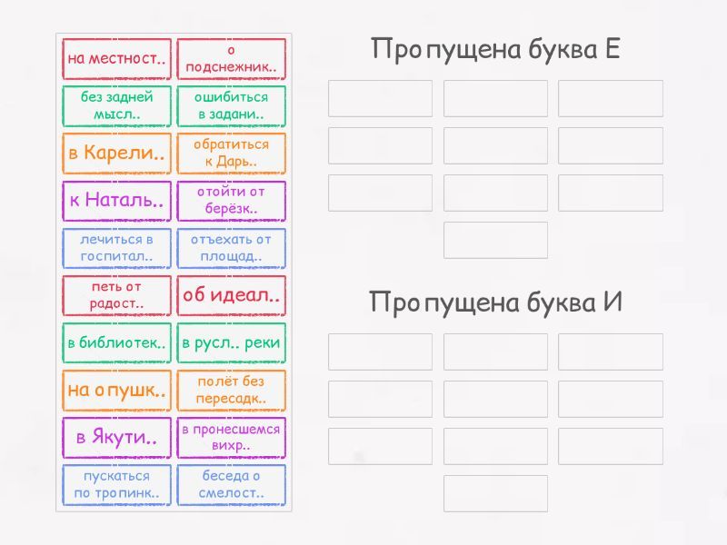 Пропущена буква Е: в библиотек.., на опушк.., лечиться в госпитал.., в русл.. реки, в пронесшемся вихр.., пускаться по тропинк.., об идеал.., к Наталь.., обратиться к Дарь.., о подснежник.., Пропущена буква И: на местност.., отъехать от площад.., в Карели.., в Якути.., без задней мысл.., ошибиться в задани.., отойти от берёзк.., беседа о смелост.., полёт без пересадк.., петь от радост..,