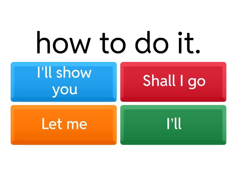 1) how to do it. a) I’ll show you b) Shall I go c) Let me d) I’ll 2) and get it? a) I’ll ask Tom b) I’ll show you c) I’ll d) Shall I go 3) have a look. a) I’ll b) Let me c) Shall I go d) I’ll show you 4) to help me. a) I’ll show you b) Let me c) Shall I go d) I’ll ask Tom 5) fix it / do it! a) Let me b) I’ll show you c) I’ll ask Tom d) I’ll