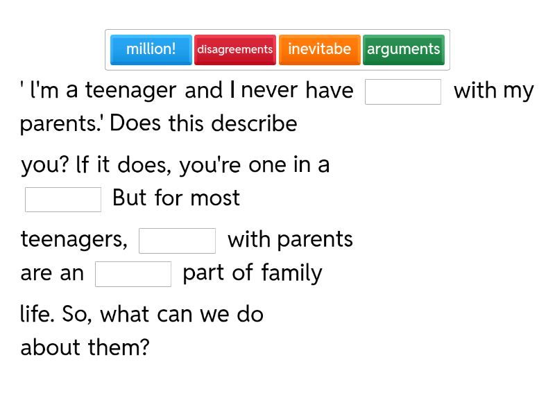 ' l'm а teenager and I never have ____ with my parents.' Does this describe you? lf it does, you're one in а ____ But for most teenagers, ____ with parents are an ____ part of family life. So, what can we do about them? When you have ____ with your parents, it' s often because you want something but they aren't willing to give it to you: getting ____ to sleep over at а friend's house, coming back home later than you ____ do, etc. The ____ is: what do you do when they say 'no'? ____ don 't get angry! Your parents aren 't saying nо to ____ you feel bad. They have their ____. So, listen to them. lf they don't give you an ____, ask them - politely! lt' s important to ____ why they' re saying 'no'. ____, you need to ____ why you're asking for something. Don't just say, for example: 'Can I have а new smartphone?' Give а ____ why: 'AII my friends have great phones and I ____ bad because mine is really ____. Also, I can't use а lot of ____ because my phone hasn't got enough ____.' When your parents understand why you're asking for something, the ____ of getting а positive ____ from them goes up! ____, you need to show that you ____ what you're asking for. lmagine that you ask for а new phone, but you're ____ all your ____ money on clothes. lt's not hard to predict your parents' reply! But the situation is completely different if you say: ' l'm ____ all my money for а smartphone but they're very ____. Can you please give me some pocket money if I help ____ in the house?' So, listen to your parents' ____, explain why you want something, and show why you ____ it. This isn't а magic ____, but it helps. Good ____