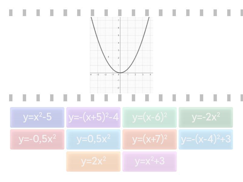 y=0,5x2, y=-0,5x2, y=2x2, y=-2x2, y=x2+3, y=x2-5, y=(x-6)2, y=(x+7)2, y=-(x+5)2-4, y=-(x-4)2+3,