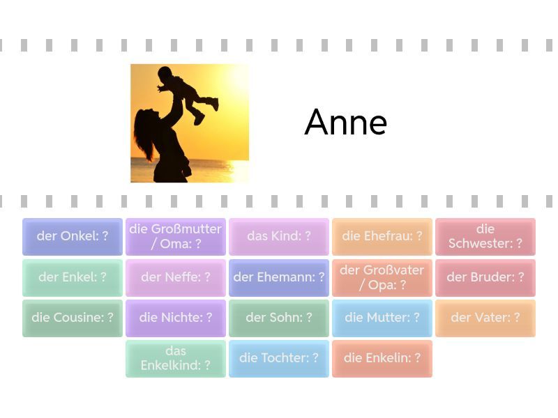 die Mutter: ? - Anne, der Bruder: ? - Erkek kardeş, der Vater: ? - Baba, die Cousine: ? - Kız kuzen, der Neffe: ? - Erkek yeğen, der Onkel: ? - Amca, dayı, der Enkel: ? - Erkek torun, der Großvater / Opa: ? - Büyükbaba (Dede), die Großmutter / Oma: ? - Büyükanne (Anneanne / Babaanne), die Tochter: ? - Kız evlat, die Schwester: ? - Kız kardeş, die Ehefrau: ? - kadın eş, der Sohn: ? - Oğul, das Kind: ? - Çocuk, der Ehemann: ? - Koca, erkek eş, das Enkelkind: ? - Torun, die Enkelin: ? - Kız torun, die Nichte: ? - Kız yeğen,