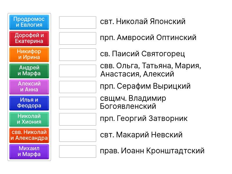 Продромос и Евлогия - св. Паисий Святогорец, Клитофон и Левкиппия - св. Галактион, Димос и Василика Кефалас - св. Нектарий Эгинский, Михаил и Евдокия - свт. Филарет Московский, Алексий и Анна - прп. Георгий Затворник, Евсевий и Екатерина - свт. Иннокентий Московский, Александр и Софья - свт. Игнатий Брянчанинов, Гавриил и Ирина - прп. Антоний Радонежский, Михаил и Марфа - прп. Амвросий Оптинский, Василий и Татьяна - свт. Феофан Затворник, Илья и Феодора - прав. Иоанн Кронштадтский, Андрей и Марфа - свт. Макарий Невский, Пётр и Агафия - архим. Кронид, герцог Эрнст Людвиг и принцесса Алиса - свв. Елисавета и Александра, Иван и Анна - св. патриарх Тихон, Николай и Хиония - прп. Серафим Вырицкий, крестьянин Иоанн - прп. Силуан Афонский, Никифор и Ирина - свщмч. Владимир Богоявленский, свв. Николай и Александра - свв. Ольга, Татьяна, Мария, Анастасия, Алексий, Феликс и Мария - исп. Лука (Войно-Ясенецкий), Афанасий и Наталья - митр. Вениамин (Федченков), Иоанн и Евдокия - свщмч. Серафим (Звездинский), Григорий и Матрона - св. Афанасий (Ковровский), Дорофей и Екатерина - свт. Николай Японский, монахиня Варвара - прп. Гавриил (Ургебадзе),