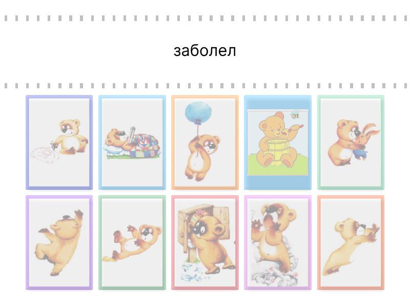 заболел, разбил чашку, летит на шарике, подскользнулся, падает, сердитый, кричит, рисует рисунок, обнимает друга, что-то толкает, куда-то лезет, ест мед,