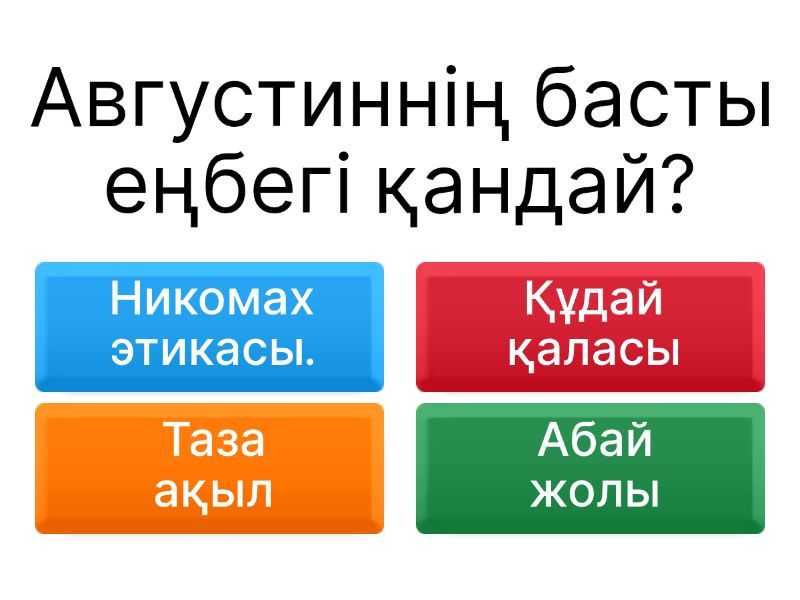 1) Августиннің басты еңбегі қандай? a) Никомах этикасы. b) Құдай қаласы c) Таза ақыл d) Абай жолы 2) Әбу Насыр Әл-Фараби кім? a) Екінші ұстаз b) Автор c) Психолог d) Ақын 3) Түсіну үшін сенуің керек кімнің сөзі? a) Ион Сина b) Аврелий Августин c) Омар Хаям d) Әбу Насыр Әл-Фараби 4) Теология мәні? a) Құдай ілімі b) Мектептік білім c) Шіркеу әкейі d) Будда ілімі 5) Даосизмнің негізін қалаушы кім? a) Конфуций b) Лао-Цзы c) Сунь Цзы d) Аристотель 6) Даосизмнің басты мақсаты неде? a) Қоғамда тәртіп орнату b) Діни рәсімдерді өткізу c) Табиғатпен үйлесімділік d) Заңды күшейту 7) Кун-Фу-Цзы кай жылдары өмір сүрген? a) Б.з.б 604-704жылдары b) Б.з.б 551-479 жылдары c) Б.з.б 605- 750 жылдары d) б.з.б 810-740 жылдары 8) Конфуцийдің басты еңбегі қандай? a) Дао Дэ Цзин b) Лунь Юй c) Чжуан-цзы d) Ян 9) Ежелгі Қытайдағы "Тянь" ұғымы нені білдіреді? a) Адам b) Жер c) Аспан d) Күн 10) Философияның анықтамасы қалай? a) Ғылымның бір саласы b) Адамның өмірі мен әлем туралы терең ойлану. c) діннің негіздері d) Білімнің бір саласы 11) Классикалық философияның негізін қалаушы кім? a) Сократ b) Платон c) Аристотель d) Конфуций 12) Дүниегекөз қарастың тарихи түрлері a) Аңыз b) Дін c) Философия d) Барлығы дұрыс 13) Тұңғыш рет"философия" терминін б.з.б Vl ғ.қолданған кім? a) Аристотель b) Пифагор c) Платон d) Сократ 14) Грек тіліне аударғанда "философия" сөзі нені білдіреді? a) Даналыққа құштарлық b) Даналыққа мейрімділік c) даналықа жол d) Сүйпенщіліктен мейірімділікке 15) Дхарма ұғымы нені білдіреді? a) Білім b) Заң, тәртіп c) бақыт d) Махаббат 16) Буддизмнің негізін қалаушы кім? a) Веданта b) Сиддхарта Гаутама (Будда) c) Махавира d) Шанкара 17) Самсара ұғымы нені білдіреді? a) Жаңа өмірдің басталуы b) Тәубе c) Тіршіліктің айналымы . d) Нирванға жету 18) Нирвана дегеніміз не? a) Жердегі бақыт b) Тіршіліктен босау, тыныштықа жету c) Дүниенің жаратылуы d) Махабаттың шыңы 19) Йога философиясының мақсаты не? a) әлеуметтік әділеттілік b) Діни сенімдерді нығайту c) Рухани үйлесім мен өзін-өзі тану d) Қоғам 20) Декарттың әйгілі сөзі қандай? a) Менің ойлайтыным, демек мен бармын." b) Мен ойлаймын, демек мен бармын." c) "Білім – күш." d) "Ақыл-ой"