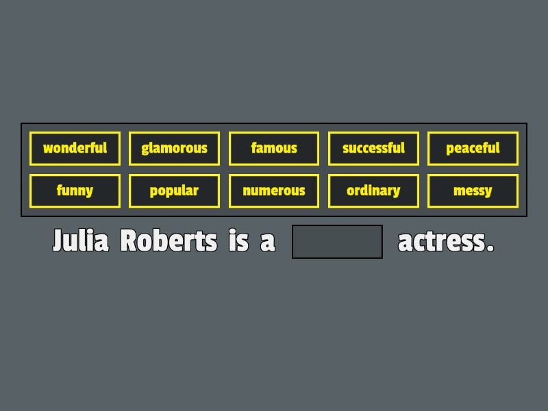 Julia Roberts is a ____ actress. She has starred in many ____ films and her latest film, Notting Hill, is no ____. She plays a ____ film star who ____ romantically involved with an ____ bookshop owner, played ____ Hugh Grant. She is trying to take a ____ break from her ____ fans. And suddenly she ends up staying in Grant's flat ____ his ____ flatmate. The script is very ____ and the film has become very ____. It is a ____ film not to be ____.