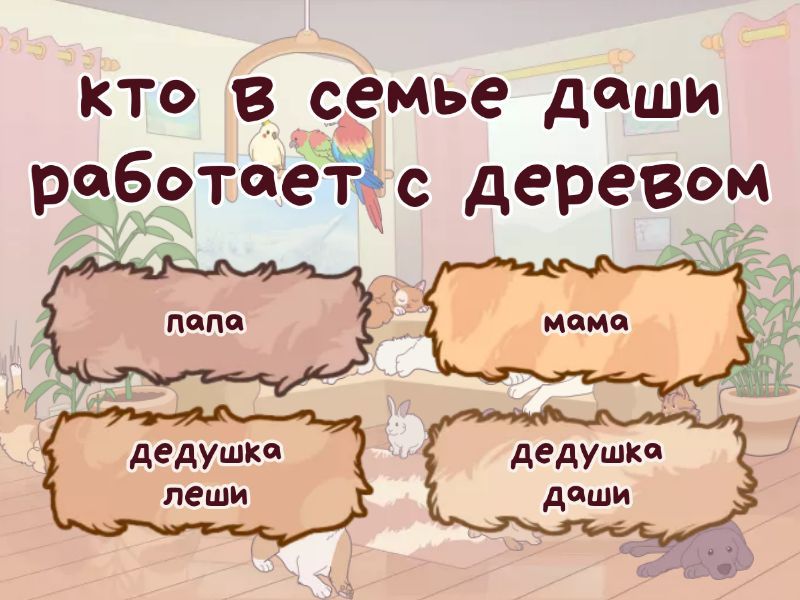 1) кто в семье даши работает с деревом a) папа b) мама c) дедушка леши d) дедушка даши 2) кто испек пирог в семье леши? a) леша b) бабушка леши c) дедушка даши d) брат даши 3) что делал Петя a) занимался деревом b) гулял c) учил Дашу ездить на велосипеде d) фотографировал 4) кто фотографировал? a) бабушка леши b) мама Даши c) дедушка Леши d) мама леши