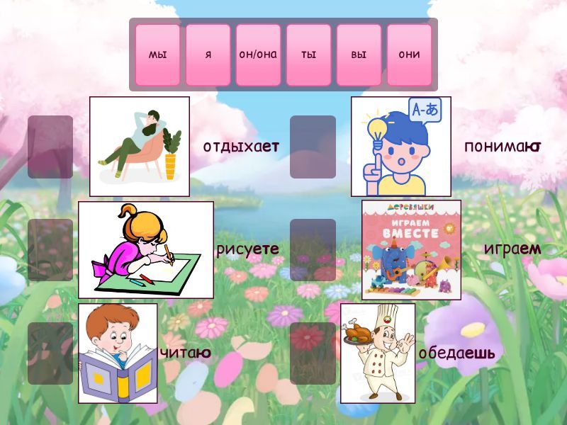 я - читаю, ты - обедаешь, мы - играем, он/она - отдыхает , вы - рисуете, они - понимают,