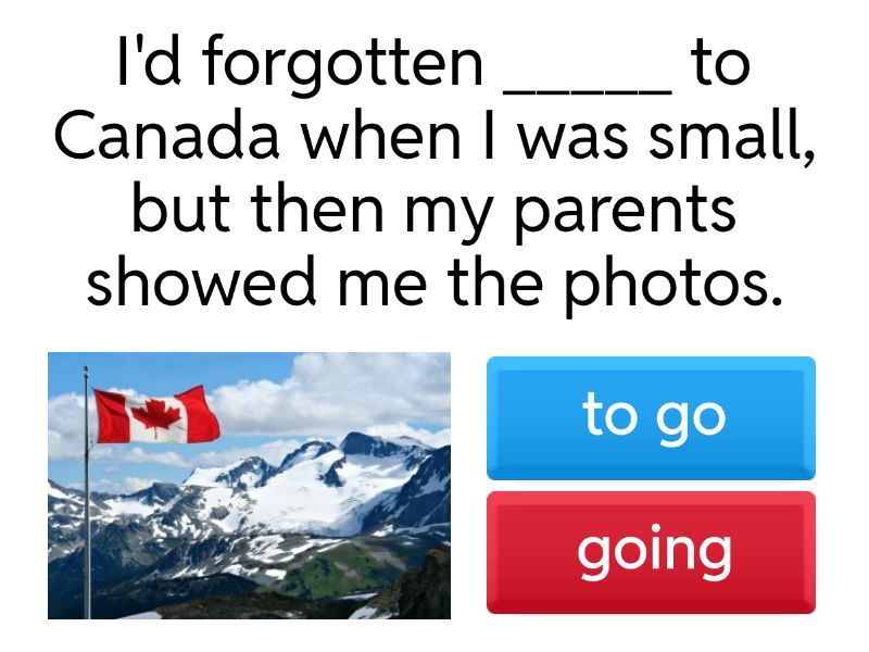 1) I'd forgotten _____ to Canada when I was small, but then my parents showed me the photos. a) to go b) going 2) I always forget _____ my alarm for Monday morning. a) to set b) setting 3) She tried _____ the whole book but it was very long and complicated. a) to read b) reading 4) You'll be OK. I remember _____ really nervous on my first day too! a) to be b) being 5) Try _____ the video with subtitles. This might help you understand better. a) to watch b) watching 6) She had to stop halfway through the race _____ the wheel on her bike. a) to repair b) repairing 7) Remember _____ your swimming costume in case we go to the pool. a) to pack b) packing 8) He's stopped _____ French classes and changed to Spanish. a) to take b) taking 9) Please remember _____ your appointment if you are unable to attend. a) to cancel b) cancelling 10) He says he feels a lot better since he stopped _____ so much bread. a) to eat b) eating 11) Have you got hiccups? Have you tried _____ a glass of water? That often helps! a) to drink b) drinking 12) There's no milk. I forgot _____ more when I went to the supermarket earlier. a) to buy b) buying 13) I know it's difficult but try not _____ about it too much. a) to think b) thinking 14) He regretted ____________ in the same job for so long. a) to stay b) staying 15) I regret ____________ you that there's been an accident. a) telling b) to tell