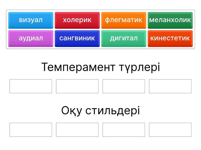 Темперамент түрлері: холерик, флегматик, меланхолик, сангвиник, Оқу стильдері: визуал, аудиал, кинестетик, дигитал,