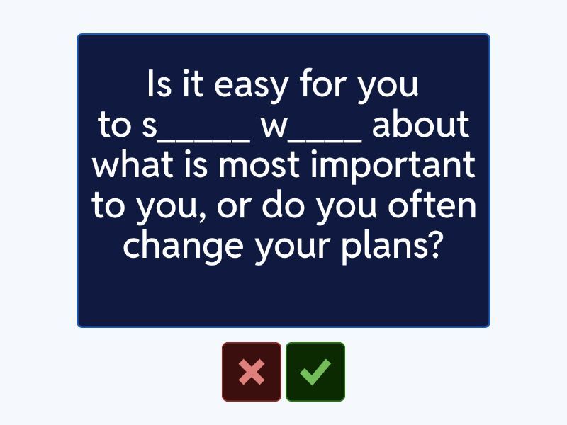 When you have to m________ a big life decision (like choosing a school or a career), what steps do you usually take? - make a decision, Is it easy for you to s_____ w____ about what is most important to you, or do you often change your plans? - stick with, Has a friend or family member ever tried to c____ your _____ about a big choice you made? Were they successful? - change your mind, Think about a valuable lesson you've learned. Did you plan to learn it, or did you c____ a___ it unexpectedly? - come across, When you face a difficult problem, is it better to s____ w_____ one solution until it works, or to try many different approaches? - stick with, Who is a person you really l____ u______ to and why? What makes them a good role model for important things in life? - look up, If you want to b____ i_____ a new hobby or habit, what is the best way to get started? - break into, What is something in your life (like your health or a relationship) that you know you need to s________ carefully and pay more attention to? - scrutinize, Imagine you could "t__ o__" a different personality trait for a week. What would you try and why? - try on, When you set a goal, how often do you r________ your progress? Is it helpful to check and adjust your plan? - revise,