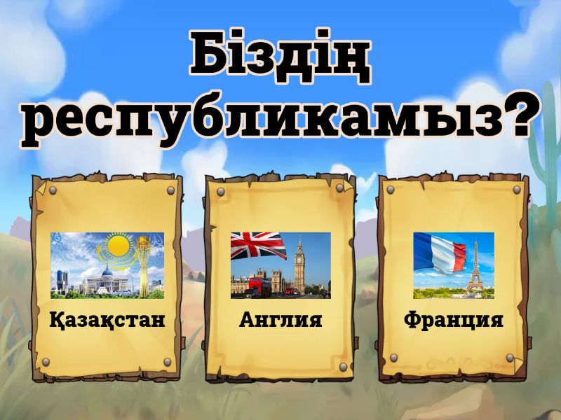 1) Біздің республикамыз? a) Қазақстан b) Англия c) Франция 2) Қазақстанның астанасы? a) Астана b) сингапур c) 3) Біздің ел таңбамыз? a) Бәйтерек b) Елтаңба c) Кітап 4) Қазақстанның туы? a) b) c) 5) Қазақстан президенті? a) Доналд Трамп b) Қасым Жомарт Тоқаев c) Ким Чен Ын 6) Біздің ақшамыз? a) Теңге b) Доллар c) Цент 7) Біздің тұратын қаламыз? a) Ақтөбе b) Шымкент c) Қарағанды