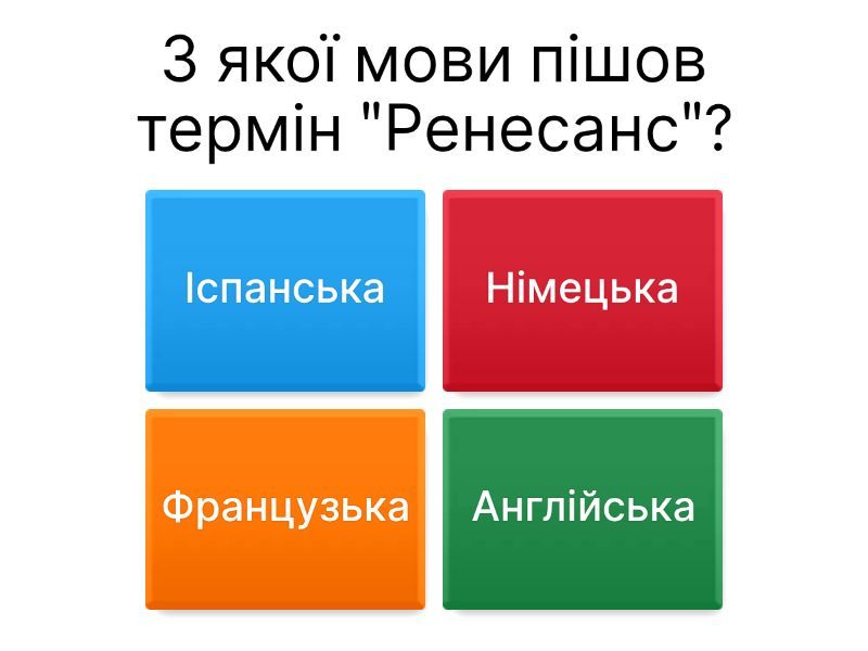 1) З якої мови пішов термін "Ренесанс"? a) Іспанська b) Німецька c) Французька d) Англійська 2) Що таке "Ренесанс"? a) Культурно-філософський рух b) Еволюція c) Період d) Характеристика 3) Скільки періодів має "Ренесанс"? a) 8 b) 3 c) 7 d) 5 4) З яких причин був створений "Ренесанс"? a) Відродження інтересу до античної культури b) Теоцентизм c) Зацікавленням східними культурами d) Повернення у дослідженнях до античної філософії 5) Яку роль починає відігравати живопис в Відродженні? a) Відходження від статичних, застиглих схем b) Нові тенденції в розвитку мистецтва. c) Становлення й розвиток європейської культури. d) Розвиток релігійних вчень
