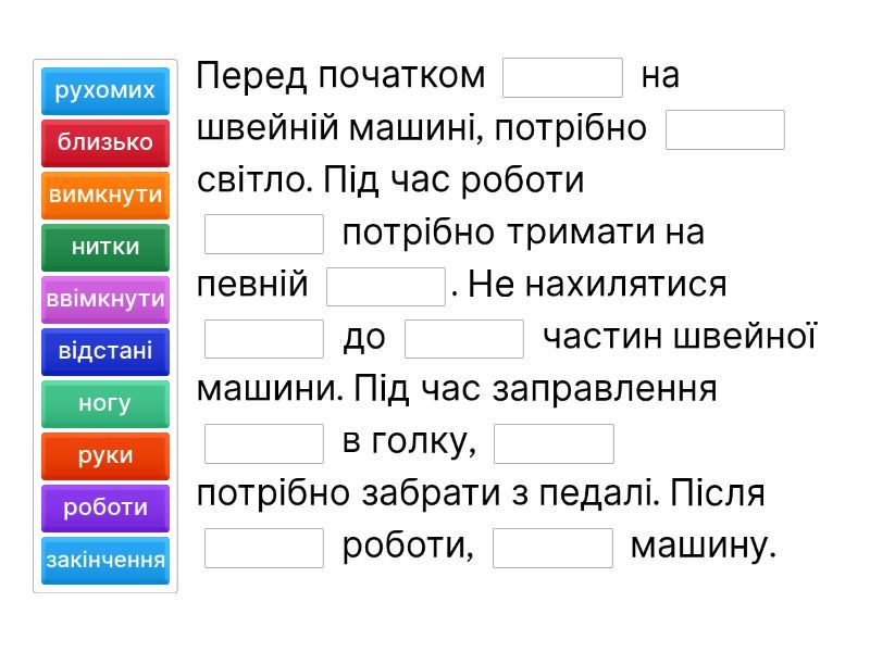 Перед початком ____ на швейній машині, потрібно ____ світло. Під час роботи ____ потрібно тримати на певній ____. Не нахилятися ____ до ____ частин швейної машини. Під час заправлення ____ в голку, ____ потрібно забрати з педалі. Після ____ роботи, ____ машину.