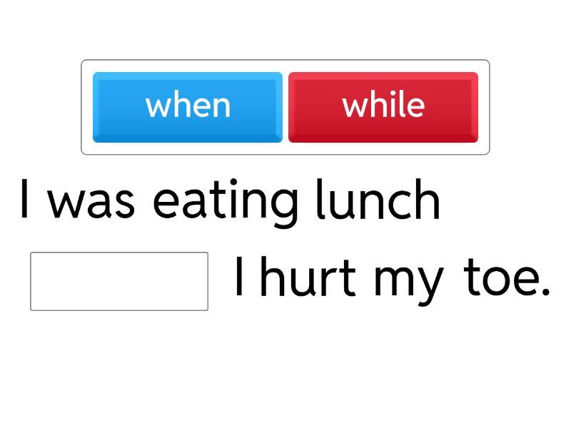 I was eating lunch ____ I hurt my toe. I saw a wizard ____ I was walking to school. The students will be learning English ____ the teacher yells. The witches were casting spells ____ the wizard turned them into leaves. I was reading my book ____ a bug flew onto my face. I saw a lion ____ I was visiting the zoo. Teacher Jessica smiled ____ she was teaching English class. Paul burned his hand ____ he was cooking dinner. Susie was climbing trees ____ she picked an apple. Chuck coughed ____ he was whistling loudly.