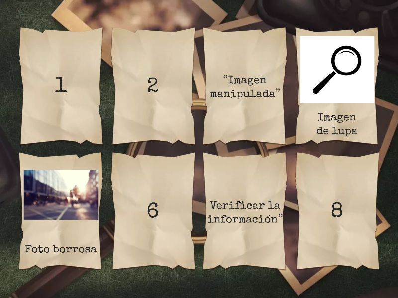 Verificar la información” - Imagen de lupa, “Imagen manipulada” - Foto borrosa, “Título sensacionalista” - Ícono de alerta, “Noticia verificada” - Computadora con check verde,