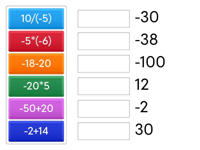 -2+14 - 12, -5*(-6) - 30, 10/(-5) - -2, -20*5 - -100, -18-20 - -38, -50+20 - -30,