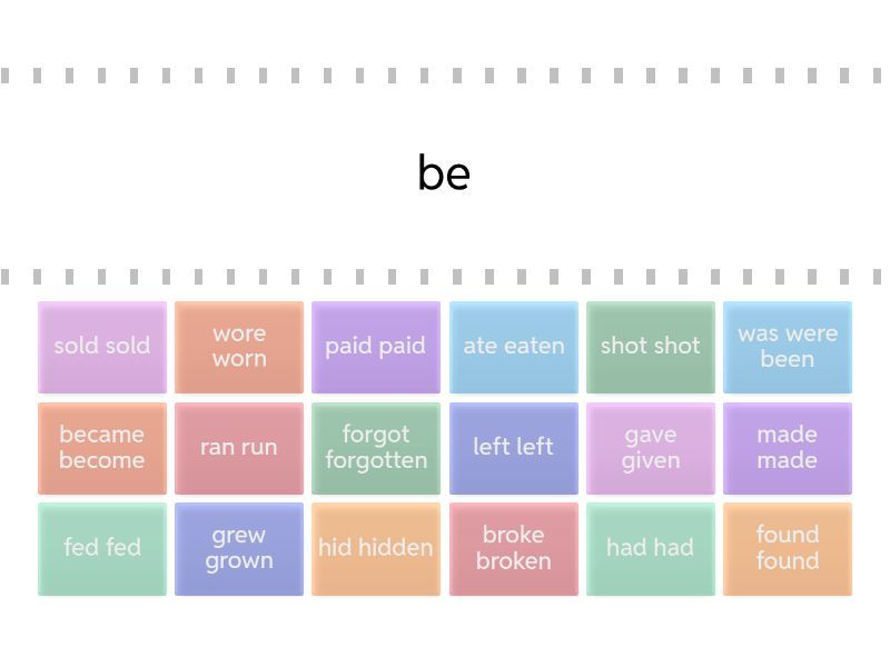 was were been - be , broke broken - break, found found - find , forgot forgotten - forget, gave given - give, grew grown - grow, had had - have , became become - become , made made - make , ate eaten - eat , ran run - run , hid hidden - hide, shot shot - shoot, sold sold - sell, left left - leave, fed fed - feed , wore worn - wear, paid paid - pay ,