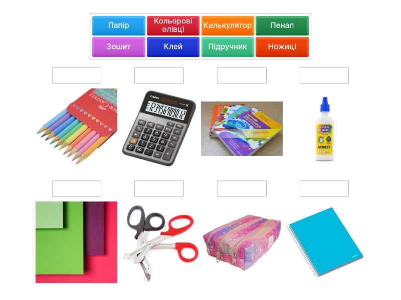 Зошит, Олівець, Гумка, Ручка, Лінійка, Пенал, Рюкзак, Підручник, Щоденник, Маркер, Ножиці, Клей, Кольорові олівці, Калькулятор, Папір, Точилка,