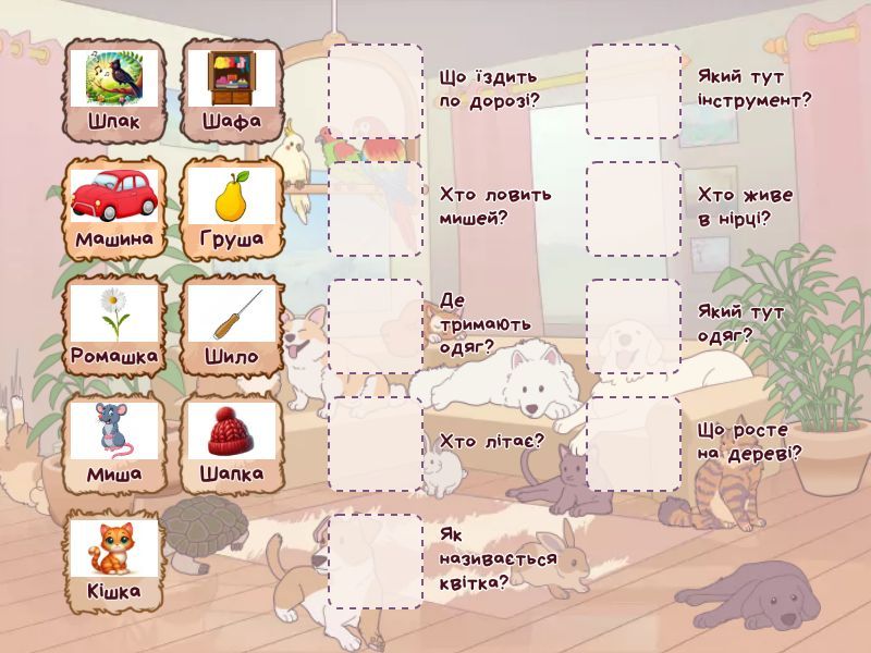 Шпак - Хто літає?, Машина - Що їздить по дорозі?, Шило - Який тут інструмент?, Кішка - Хто ловить мишей?, Шапка - Який тут одяг?, Миша - Хто живе в нірці?, Груша - Що росте на дереві?, Ромашка - Як називається квітка?, Шафа - Де тримають одяг?,