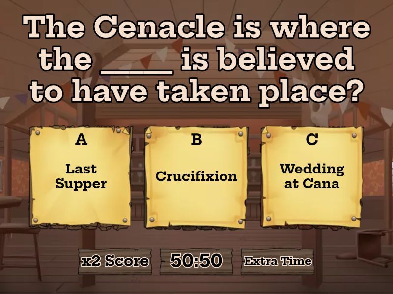1) The Cenacle is where the _____ is believed to have taken place? a) Last Supper b) Crucifixion c) Wedding at Cana 2) Jesus rode on a ____ as people laid palm branches down shouting "Hosanna to the son of David!" a) donkey b) alpaca c) horse d) stag 3) What did Jesus & his disciples eat during the Last Supper? a) dates b) figs c) bread d) chicken nuggets 4) Jesus took bread, and when he had given thanks, he ____ it and gave it to his disciples, saying, “Take and eat; this is my body.” a) broke b) tasted c) blessed 5) Then he took a cup, and when he had given thanks, he gave it to them, saying, “___ from it, all of you. a) Wash b) Drink c) Spill 6) This is my blood of the covenant, which is poured out for many for the ____ of sins. a) forgiveness b) plentiful c) enrichment 7) _____ was disguised in a wedding dress. a) Delilah b) Adriana c) Pearl 8) They snuck through the ___ gate into the Armenian Quarter of the Old City. a) Zion b) David c) Bronze 9) When they saw souvenir crosses and paintings of Jesus in the shops around them, they knew they were in the _____ Quarter. a) Armenian b) Muslim c) Christian d) Jewish 10) They made it to the courtyard of an ancient church called ___. a) Holy Hightop b) Holy Sepulchre 11) The church of the Holy Sepulchre is built on the site of the ______. a) crucifixion b) resurection c) Last Supper