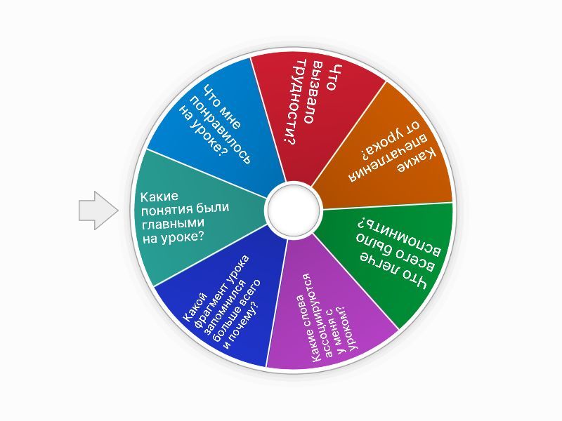 1) Что мне понравилось на уроке? 2) Что вызвало трудности? 3) Какие впечатления от урока? 4) Что легче всего было вспомнить? 5) Какие слова ассоциируются у меня с уроком? 6) Какой фрагмент урока запомнился больше всего и почему? 7) Какие понятия были главными на уроке?