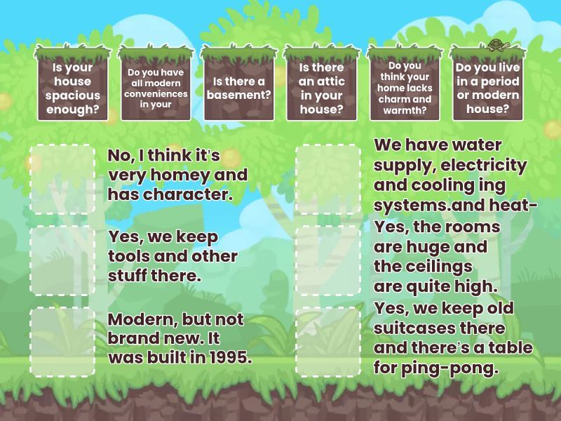 Do you live in a period or modern house? - Modern, but not brand new. It was built in 1995., Is there an attic in your house? - Yes, we keep old suitcases there and there’s a table for ping-pong., Is there a basement? - Yes, we keep tools and other stuff there., Is your house spacious enough? - Yes, the rooms are huge and the ceilings are quite high., Do you have all modern conveniences in your - We have water supply, electricity and cooling ing systems.and heat-, Do you think your home lacks charm and warmth? - No, I think it’s very homey and has character.,