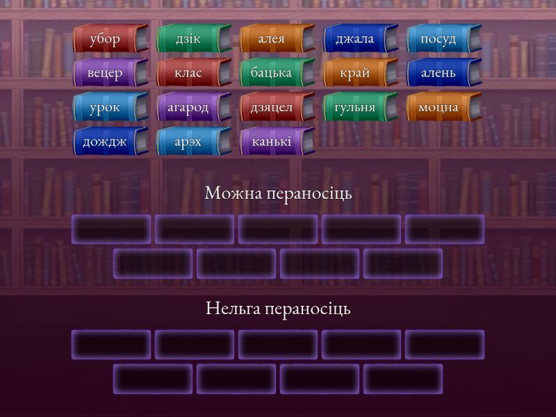 Можна пераносіць: моцна, джала, дзяцел, вецер, канькі, агарод, бацька, посуд, гульня, Нельга пераносіць: край, алень, клас, убор, дзік, алея, арэх, дождж, урок,