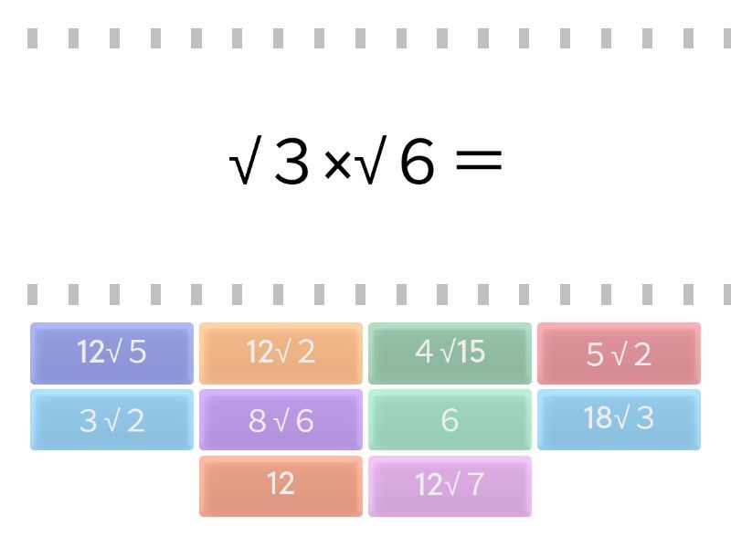 3√2 - √3×√6=, 5√2 - √10×√5=, 12√2 - √6×4√3=, 4√15 - 2√10×√6=, 12√7 - 2√2×3√14=, 12√5 - 4√3×√15=, 6 - √2×√6×√3=, 12 - √2×√12×√6=, 8√6 - √12×2√8=, 18√3 - √18×3√6=,
