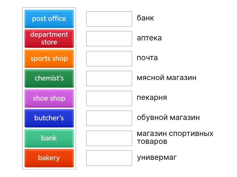 jeweller's - ювелирный магазин , bakery - пекарня, bookshop - книжный магазин, chemist's - аптека , department store - универмаг, electrical goods shop - магазин электроники , greengrocer's - фрукты/овощи, newsagent's - газетный киоск, post office - почта, shoe shop - обувной магазин, sports shop - магазин спортивных товаров, stationery shop - канцелярский магазин, supermarket - супемаркет, bank - банк, butcher's - мясной магазин, clothes shop - магазин одежды,