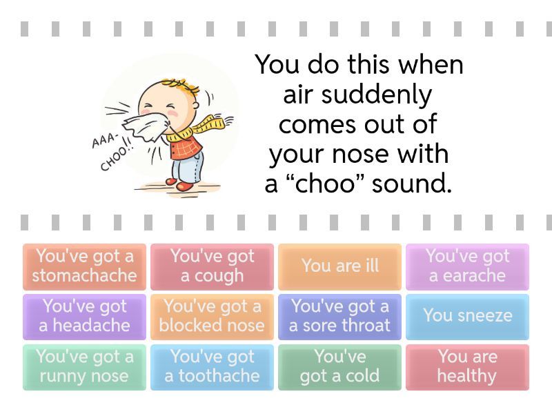 You sneeze - You do this when air suddenly comes out of your nose with a “choo” sound., You've got a cough - You make this sound when your throat hurts or you are sick., You've got a blocked nose - You can’t breathe well through your nose., You've got a cold - You feel sick, sneeze, and have a runny nose., You've got a earache - Your ear hurts., You've got a a sore throat - Your throat hurts when you swallow or talk., You've got a runny nose, You've got a stomachache - Your stomach hurts., You've got a headache - Your head hurts., You've got a toothache - Your tooth hurts., You are healthy - You feel good and your body works well., You are ill - You feel bad and your body is not well.,
