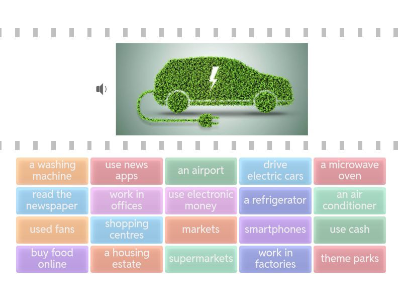 drive electric cars, a microwave oven, used fans, use cash , use electronic money, a refrigerator , an air conditioner, a housing estate , buy food online, shopping centres, theme parks, a washing machine , an airport , work in offices , work in factories , supermarkets, markets, smartphones, read the newspaper , use news apps,