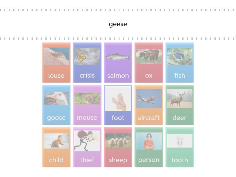 goose - geese, sheep - sheep, child - children, deer - deer, mouse - mice, foot - feet, tooth - teeth, louse - lice, salmon - salmon, fish - fish, ox - oxen, aircraft - aircraft, person - people, thief - thieves, crisis - crises,
