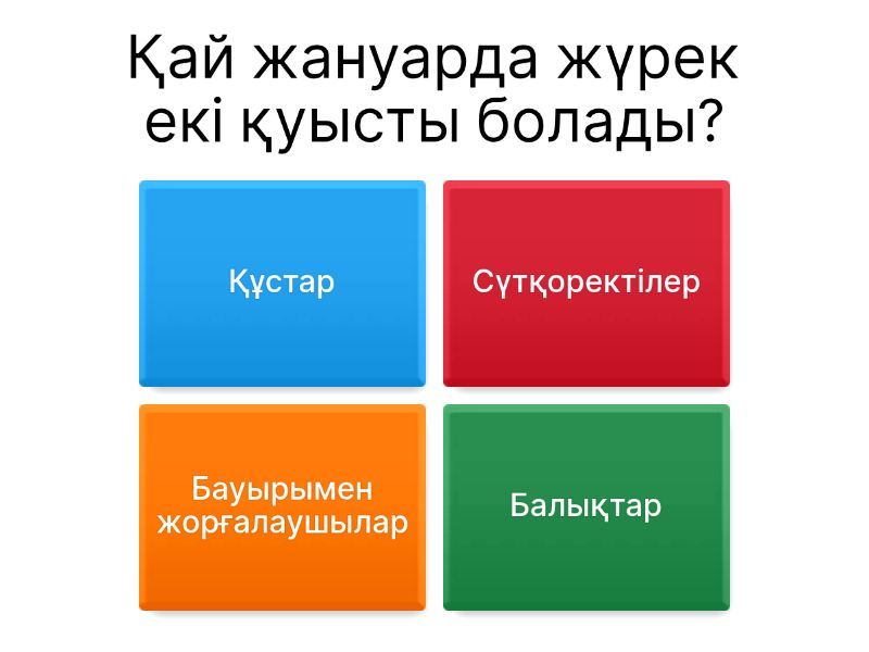 1) Қай жануарда жүрек екі қуысты болады? a) Құстар b) Сүтқоректілер c) Бауырымен жорғалаушылар d) Балықтар 2) 3 қуысты жүрек қай жануарларда кездеседі? a) Құстар b) Қосмекенділер c) Сүтқоректілер d) Балықтар 3) 4 қуысты жүрек қандай жануарларда болады? a) Құстар және сүтқоректілер b) Қосмекенділер c) Балықтар d) Бунақденелілер 4) Артерия қабырғасының негізгі ерекшелігі: a) Жұқа және созылғыш b) Қақпақшалар бар c) Қалың, серпімді, жоғары қысымға төзімді d) Кең қуысты 5) Вена қабырғасының ерекшелігі: a) Қақпақшалары бар, қабырғасы жұқа b) Қалың бұлшық ет қабаты c) Қысым өте жоғары d) Тек өкпеге қан апарады 6) Капиллярлардың негізгі қызметі: a) Қанды жүрекке әкелу b) Газ және зат алмасу c) Қанды өкпеге айдау d) Қан қысымын реттеу 7) Жүректің оң жақ бөлігі қандай қанды тасымалдайды? a) Тек артериялық b) Оттегі мол c) Аралас d) Көктамыр (веналық) 8) Жүректің сол жақ қарыншасы оң жақ қарыншаға қарағанда неге қалың? a) Көбірек қан жинайды b) Қақпақша жоқ c) Қанды бүкіл денеге айдайтындықтан қысым жоғары d) Оттегіні көбірек алады 9) Қан тамырларының қай түрінде қақпақша болады? a) Веналарда b) Артерияда c) Капиллярларда d) Артериолаларда 10) Жүрек пен қантамыр жүйесінің негізгі маңызы: a) Жүйке импульсін таратады b) Судың буын тасымалдайды c) Жылу бөлуді азайтады d) Заттар мен газдарды ағза ұлпаларына жеткізеді