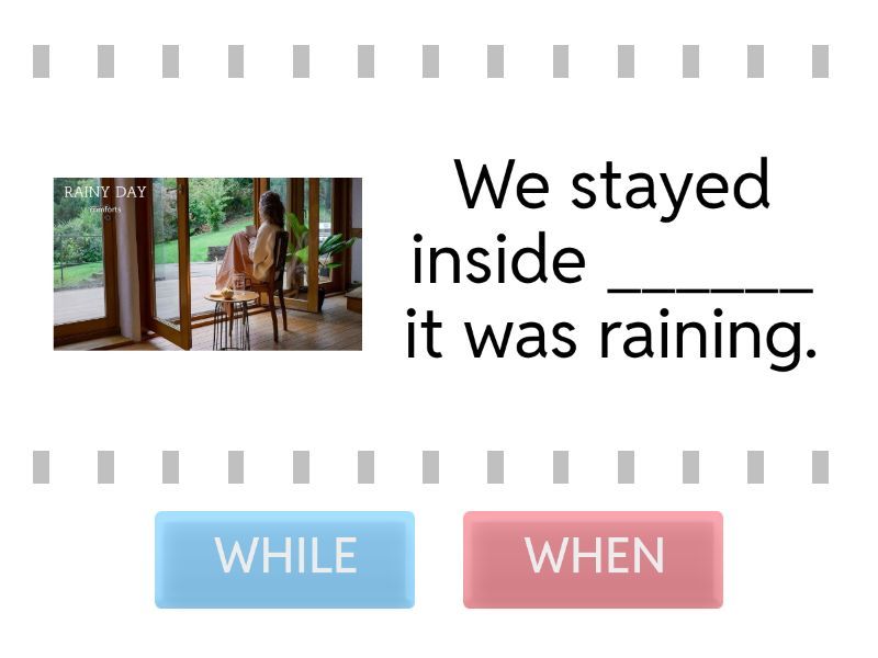 WHILE: We stayed inside ______ it was raining., They saw dolphins ______ they were sailing, He saw the bear ____ he was walking in the forest., The film started ________Mia was getting some popcorn., Nicola laughed at me ____________ I was singing!, WHEN: The dog was running towards me _____ it suddenly stopped, Dora was cutting the cake ______Tobias arrived., I was surprised _____ I heard the news., The cat was eating a fish_________ I saw it., Kate was walking home ______ she saw an accident.,