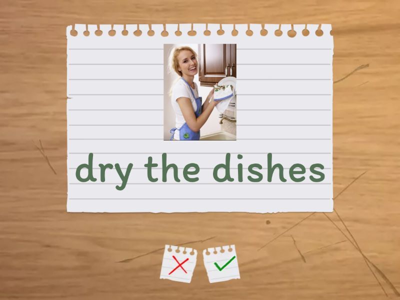 Clean the cooker - чистити плиту, Clear the table - прибирати зі столу, lay the table - накривати на стіл, Decorate a cake - прикрашати торт, Do all the housework - робити всю роботу по дому, Dust the shelves - витирати пил з полиць, Empty the washing machine - вивантажувати пральну машину, load the washing machine - завантажувати пральну машину , Fold the clothes - складати одяг, Iron your clothes - прасувати одяг, Make the bed - застеляти ліжко, Put away clothes - прибирати одяг (на місце), sweep the floor - підмітати підлогу, take out the rubbish - виносити сміття, tidy your room - прибирати в кімнаті, wash the dishes - мити посуд, dry the dishes - втирати посуд, water the plants - поливати рослини,