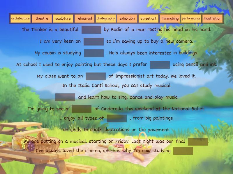 The Thinker is a beautiful ____ by Rodin of a man resting his head on his hand. I am very keen on ____ so I’m saving up to buy a new camera. My cousin is studying ____ . He’s always been interested in buildings. At school I used to enjoy painting but these days I prefer ____ using pencil and ink. My class went to an ____ of Impressionist art today. We loved it. In the Italia Conti School, you can study musical ____ and learn how to sing, dance and play music. I’m going to see a ____ of Cinderella this weekend at the National Ballet. I enjoy all types of ____ , from big paintings on walls to chalk illustrations on the pavement. We are putting on a musical, starting on Friday. Last night was our final ____. I’ve always loved the cinema, which is why I’m now studying ____ .