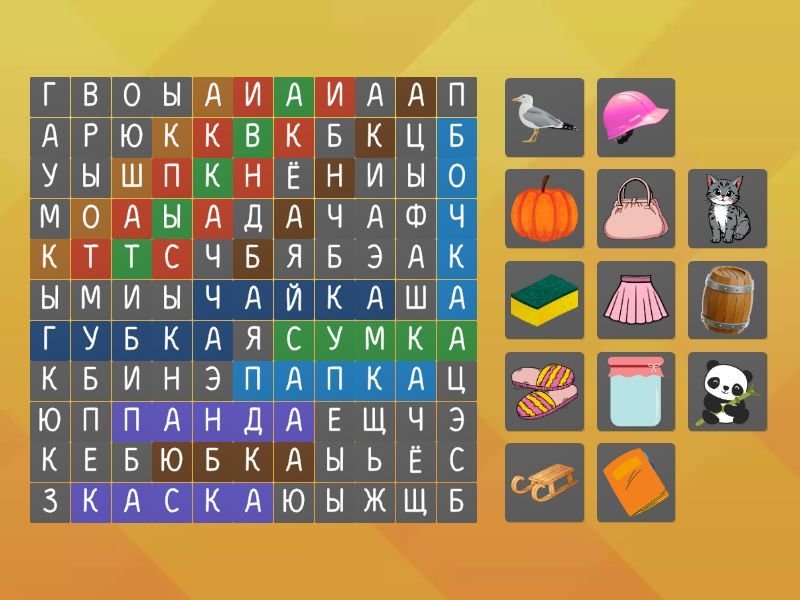 СУМКА, КАСКА, САНКИ, ПАПКА, ЮБКА, ГУБКА, КОШКА, ТЫКВА, ПАНДА, ТАПКИ, БОЧКА, БАНКА, ЧАЙКА,