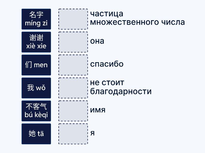 你 nǐ - ты, 他 Tā - он , 她 tā - она, 我 wǒ - я, 是 shì - являться , 叫 jiào - звать, называть , 们 men - частица множественного числа , 谢谢 xiè xie - спасибо , 不客⽓ bú kèqi - не стоит благодарности , 什么 shén me - что? какой?, 名字 míng zi - имя ,