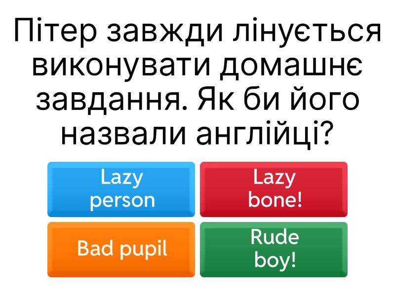 1) Пітер завжди лінується виконувати домашнє завдання. Як би його назвали англійці? a) Lazy person b) Lazy bone! c) Bad pupil d) Rude boy! 2) Сашко чхнув у вашій присутності. Як ви побажаєте йому здоров’я? a) I wish you healthy b) Get well soon! c) Bless you d) Try to keep fit 3) У перекладі з англійської мови який напій перекладається як “хвіст півня”? a) coca cola b) cocktail c) cocoa d) coffee 4) Якого кольору традиційне лондонське таксі? a) red b) yellow c) black d) white 5) Яка друга назва найбільшої годинникової вежі Лондона? a) The Eiffel Tower b) The Tower of London c) Elizabeth Tower d) Big Ben 6) Як ви побажаєте своїм однокласникам у їдальні приємного апетитy? a) This lunch is delicious. b) Yummy! Yummy! c) Enjoy your meal! d) We enjoy our meals. 7) У розкладі британських школярів назви деяких предметів позначають літерами для скорочення. На якому з цих предметів вивчають англійську мову? a) IT b) EFL c) PE d) ICT