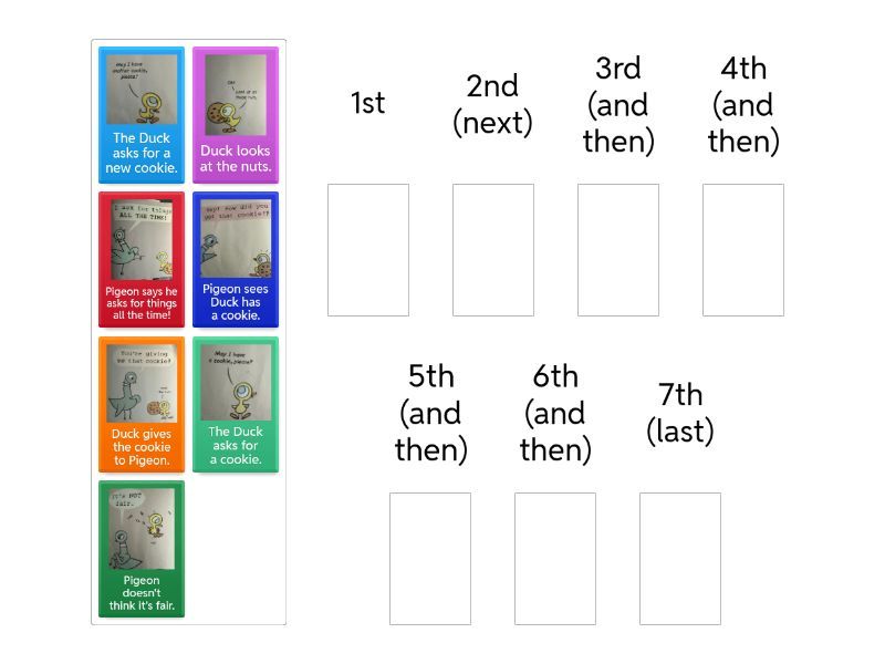 1st: The Duck asks for a cookie., 2nd (next): Duck looks at the nuts., 3rd (and then): Pigeon sees Duck has a cookie., 4th (and then): Pigeon says he asks for things all the time!, 5th (and then): Pigeon doesn't think it's fair., 6th (and then): Duck gives the cookie to Pigeon., 7th (last): The Duck asks for a new cookie.,
