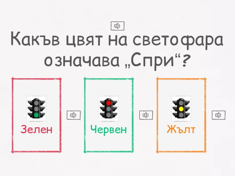 1) Какъв цвят на светофара означава „Спри“? a) Зелен b) Червен c) Жълт 2) Къде трябва да пресичаме улицата? a) Където ни е удобно b) На пешеходна пътека c) Между паркирани коли 3) Кое е най-важното преди да стъпим на пътя? a) Да погледнем телефона b) Да погледнем наляво и надясно c) Да тичаме бързо 4) Трябва ли да играем близо до пътното платно? a) Да b) Не c) Само ако е тихо 5) Когато светне зелено за пешеходци, можем ли да тичаме? a) Да b) Не, пресичаме спокойно c) Ако бързаме 6) Къде се движат пешеходците? a) На уличното платно b) На тротоара c) Между колите