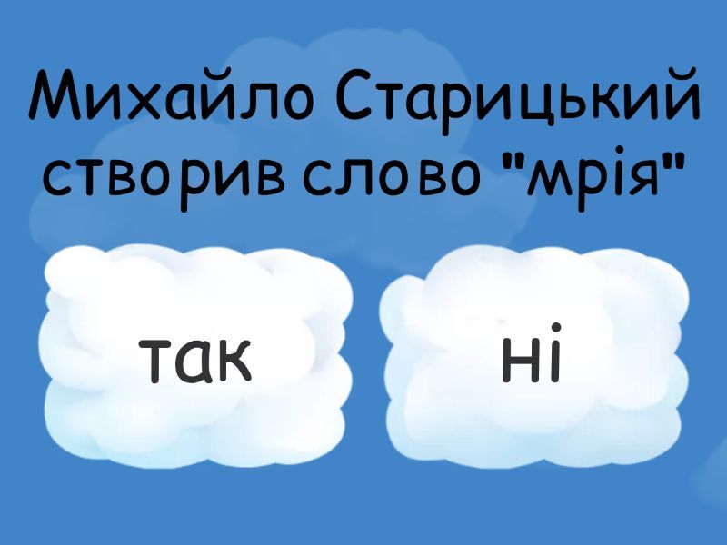 1) Михайло Старицький створив слово "мрія" a) так b) ні 2) Михайло Старицький перекладав "Гамлета" Вільяма Шекспіра a) так b) ні 3) Михайло Старицький – дядько Лесі Українки a) так b) ні 4) Мав псевдонім "Карпівець" a) так b) ні 5) У Києві були надруковані казки Ганса Крістіана Андерсена в його перекладі a) так b) ні 6) "Я думаю, що моя сила найбільша в драмі", – писав Михайло Старицький Іванові Франку a) так b) ні 7) Є режисером п'єси "За двома зайцями" a) так b) ні 8) Чоловік української письменниці Людмили Старицької-Черняхівської a) так b) ні 9) Його мати походила з родини Лисенків a) так b) ні 10) Перші твори Старицького були надруковані 1838 року a) так b) ні 11) Творчість Михайла Старицького не була пов'язана з Театром корифеїв a) так b) ні 12) Ніколи не писав поезію a) так b) ні