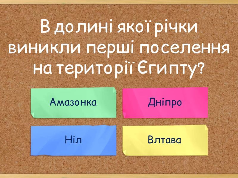 1) В долині якої річки виникли перші поселення на території Єгипту? a) Амазонка b) Дніпро c) Ніл d) Влтава 2) Як називалась система зрошення, яку використовували єгиптяни? a) іригаційна b) ієрархічна c) дощувальна d) крапельна 3) Першим фараоном Єгипту став a) Тутанхамон b) Хеопс c) Рамзес d) Міна 4) Який матеріал єгиптяни найчастіше використовували для письма? a) папірус b) пергамент c) глиняні таблички d) тканину 5) Для якого фараона було збудовано першу піраміду? a) Тутанхамон b) Міна c) Джосер d) Клеопатра 6) Якої з перерахованих верств населення не було в Давньому Єгипті? a) селяни b) ремісники c) писці d) лицарі 7) Про якого бога йде мова: Щодня на світанку він випливає на своєму човні на сході і рухається небом, освітлюючи землю і даруючи життя. a) Ра b) Анубіс c) Гор d) Сехмет 8) Новий рік давні єгиптяни святкували 19 липня. Як ви вважаєте, яка подія була настільки важливою для єгиптян, що стала початком року? a) початок розливу річки Ніл b) день народження фараона Міни c) початок зими в Єгипті d) середина літа 9) Чому давньоєгипетські скульптори часто зображали Сфінксів — істоту з головою людини чи тварини і тілом лева. a) Сфінкси жили в Давньому Єгипті b) Це було втілення бога Ра c) Сфінкс охороняв душі померлих царів d) вони не знали як виглядає голова лева 10) Чому занепала єгипетська держава? a) Єгипет ослаб і був завойований персами b) Єгипет розділився на два царства - Верхнє та Нижнє c) Єгипет завоювали трипільці d) Ніл перестав розтікатись